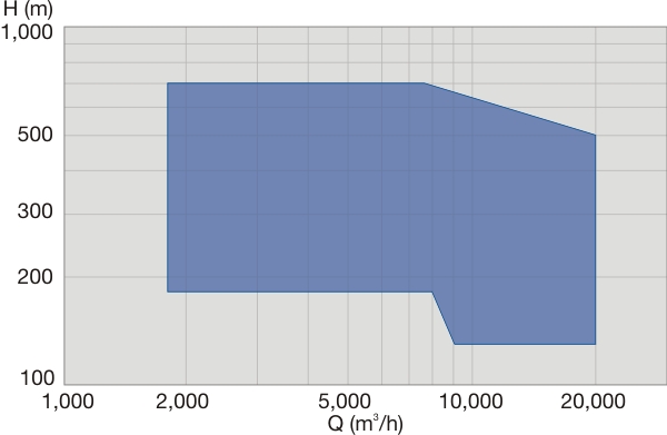 產品性能 流量:~20000m3/h 揚程:~700m 介質溫度(T):-40℃≤T<+160℃ 壓力:單級泵2.5Mpa, 雙級泵5.0Mpa 設計標準:API610